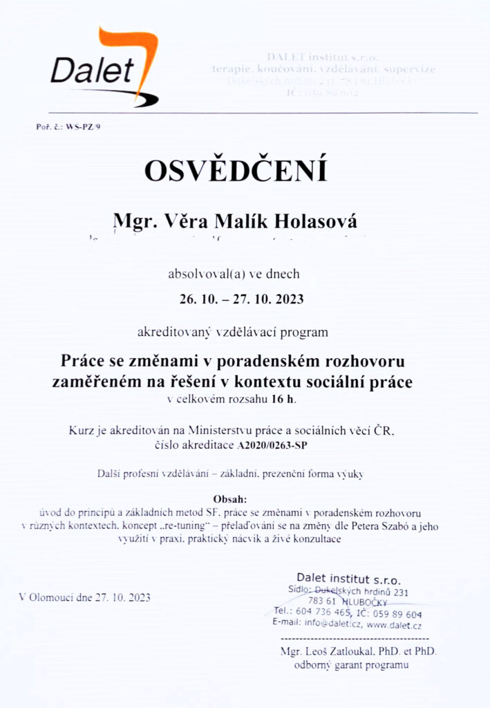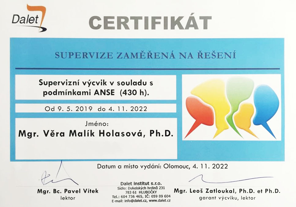 Absolvován výcvik Supervize a koučování v přístupu zaměřeném na řešení (2019-2022), DALET s.r.o.