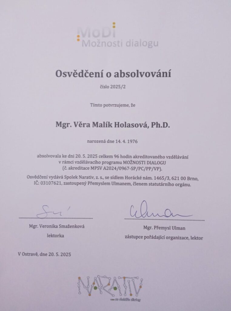 Další: MODI- Možnosti dialogu NARATIV Brno, kurz Facilitace a skupinová dynamika, workshop – Ben Furman Supervize zaměřená na řešení v praxi, kurz Lektorské dovednosti, Stres management – zvládání stresu aj.